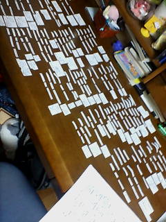 プリント冊子から選択式で薬用植物の和名・ラテン名・含有成分名・構造式・化合物の分類・骨格等がテストに出るというので、プリントをコピーして全部バラバラに切り離して、この2日間ひたすら机の上で並べ替えて覚えるという作業をしています(*;'⊿`*)つミ